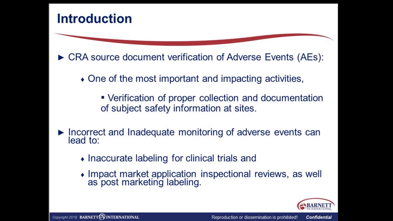 During monitoring visits, one of the most important and impacting activities that a Clinical Research Associate (CRA) performs is the source document verification of Adverse Events (AEs). The CRA serves as the eyes for the research sponsor when it comes to proper collection and documentation of subject safety information. Incorrect and inadequate monitoring of AEs can lead to inaccurate labeling for clinical trials and impact market application inspectional reviews, as well as post-marketing labeling. This includes causality, expectedness/unanticipated, and other important concepts. This includes Causality, Expectedness/Unanticipated, and other important concepts. Case scenarios will be used to apply the information for better learning.
