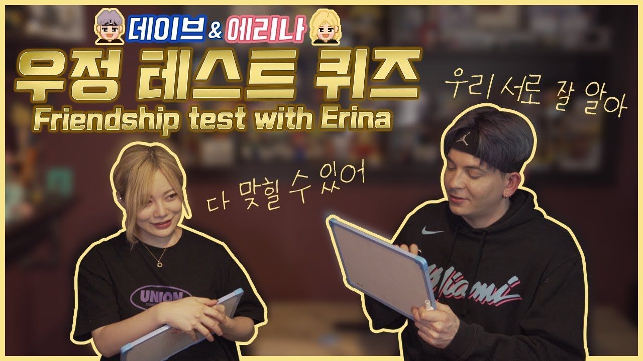 안녕하세요! 이번 영상에서는 에리나와 함께 서로에 대해 맞혀보는 퀴즈를 해보았습니다. 과연 저희 둘 중에 누가 더 서로에 대해 잘 알까요?? 저희는 하면서 재밌었는데 여러분도 보실 때 재밌으셨으면 좋겠어요! 감사합니다^^ Hello againnnn. Today Erina & I test eachother's knowledge of eachother. Who knows eachother best? We had a lot of fun doing this and I hope you guys have fun watching it as well. Enjoy :) 인스타그램/Instagram - [Dave - daebbuing] [Erina-Erina_hrn]